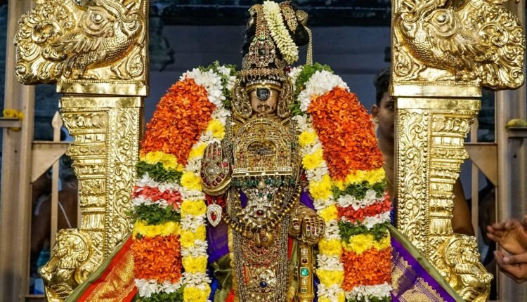 பின்புறம் – புஜ கீர்த்தி ; அண்ட பேரண்ட பக்ஷி பதக்கம்; காசு மாலையும் தழைந்து வரும் படி சாற்றி, கையில் தாயத்து சரங்கள், தங்க தண்டைகள் திருவடியில் அணிந்து மூலஸ்தானத்திலிருந்து புறப்பாடாகி அர்ச்சுன மண்டபத்தில் எழுந்தருளி சேவை சாதித்து வருகிறார்.