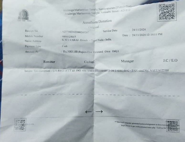 அவ்வாறு தனது திருமணம் முடிந்து கோவிலுக்கு வருகை தந்த செல்வராஜ் கடந்த 24/11/2024 அன்று கோவிலில் உள்ள தகவல் மையத்தில் மதியம் 12.14 மணி அளவில் அன்னதானத்திற்காக 5001ரூபாய் பணம் கட்டியுள்ளார்.
