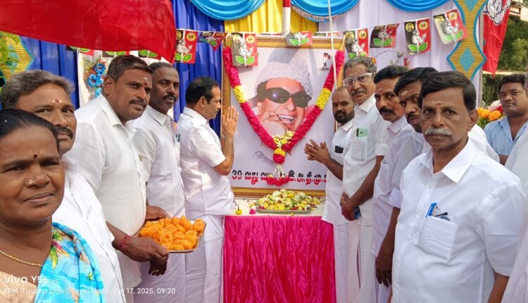 39 வது வட்டம் மஞ்சள் திடல் பாலம் அருகில் திருச்சி புறநகர் தெற்கு மாவட்ட கழக செயலாளர் ப குமார் தலைமையில் எம்ஜிஆரின் திருவுருவ படத்திற்கு மலர் தூவி மரியாதை செய்யப்பட்டது.