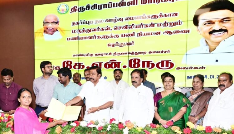 நகராட்சி நிருவாகத்துறை அமைச்சர் கே.என்.நேரு திருச்சி மாநகராட்சி மைய அலுவலகத்தில் இன்று நடைபெற்ற நிகழ்ச்சியில் நகர்நல மையங்கள் மற்றும் அரசு மருத்துவ மனைகளில் பணிபுரியவுள்ள மருத்துவர்கள்,செவிலியர்கள் மற்றும் மருத்துவ பணியாளர்கள் உள்ளிட்ட 37 நபர்களுக்கு பணி நியமன ஆணைகளை வழங்கி சிறப்பான முறையில் பணிபுரிய வாழ்த்தினார்.