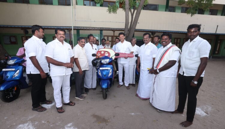 திருச்சியில் அமைச்சர் மகேஷ் பொய்யாமொழி ரூ.5.9 லட்சம் மதிப்புள்ள மாற்றுத்திறனாளிகளுக்கு 3 சக்கர வாகனங்களை வழங்கினார் .