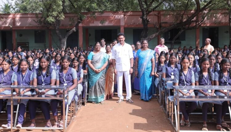 திருச்சியில் அரசுப் பள்ளிகளுக்கு ரூ.10.66 லட்சம் மதிப்பிலான 200 இருக்கைகள், மேஜைகள் அமைச்சர் அன்பில் மகேஷ் பொய்யாமொழி வழங்கினார்.