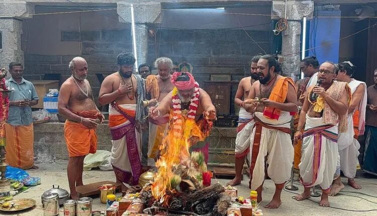 இதையொட்டி, வெள்ளிக்கிழமை காலை 7 மணிக்கு விக்னேஸ்வர பூஜை நடைபெற்றது. தொடா்ந்து யஜமான சங்கல்பம், புண்யாஹவாசனம், பஞ்சகவ்யம்,