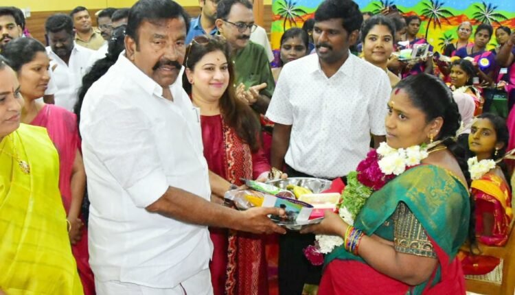 திருச்சியில் கர்ப்பிணி பெண்களுக்கு சமுதாய வளைகாப்பு நிகழ்வு.அமைச்சர் கே.என்.நேரு சீர்வரிசை வழங்கி வாழ்த்து