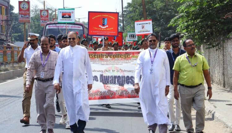திருச்சி செயின்ட் ஜோசப் கல்லூரி மாணவர் பேரவை அய்க்கஃப் இயக்கம் மற்றும் அருப்பே சுகாலயம் சார்பில் போதை விழிப்புணர்வு வார விழா நடைபெற்று வருகிறது. தமிழ்நாட்டை போதைநோய் இல்லா மாநிலமாக உருவாக்கும் நோக்கில் விழிப்புணர்வுப் பேரணி, கருத்தரங்கு, பட்டிமன்றம், மற்றும் மாவட்ட அளவில் கலைப் போட்டிகள் என பல்வேறு நிகழ்ச்சிகள் நடைபெற்றன. திருச்சி சத்திரம் பேருந்து நிலையத்தை ஒட்டிய சாலையில் நடைபெற்ற விழிப்புணர்வுப் பேரணியில் பல்வேறு மாணவ மாணவியர் பங்கேற்றனர். தொடர்ந்து நடைபெற்ற நிறைவு விழாவில் கல்லூரி அதிபர் அருள் முனைவர் பவுல்ராஜ் மைக்கிள் சே ச செயலர் அருள் முனைவர் அமல் முதல்வர் அருள் முனைவர் மரியதாஸ் இணை முதல்வர் அருள்தந்தை பிரன்சிஸ் ஜெயபதி மற்றும் மகாத்மா காந்தி அரசு மருத்துவமனை உளவியல் துறைத்தலைவர் மருத்துவர். நிரஞ்சனா தேவி ஆகியோர் சிறப்பு விருந்தினராகப் பங்கேற்றனர்.