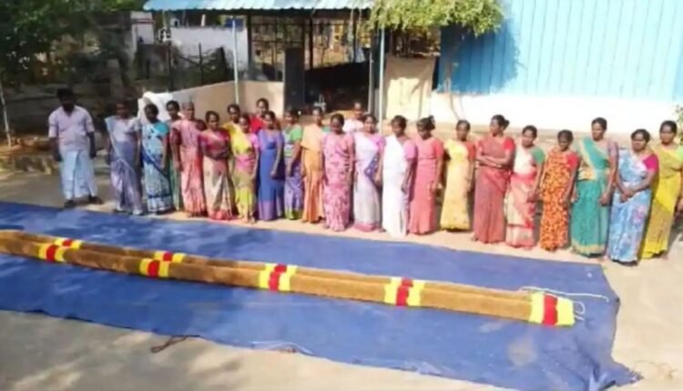 மொத்தம் அரை ஏக்கர் பரப்பளவில் இருந்து வெட்டி எடுக்கப்பட்ட வெட்டி வேரை கொண்டு, 8 பேர் கொண்ட தொழிலாளர்கள் குழு தொடர்ந்து 15 நாள்கள் உழைத்து, அழகிய மெகா சைஸ் மாலையை உருவாக்கி உள்ளனர்.