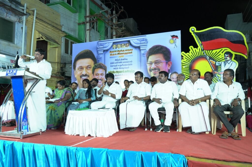 பாராளுமன்ற தொகுதி மறு சீரமைப்பு என்ற பெயரில் அநீதியை இழைப்பது என பல்வேறு அநீதிகளில் ஈடுபடும் ஒன்றிய அரசை கண்டித்து திருச்சி தெற்கு மாவட்ட செயலாளரும், தமிழக பள்ளிக்கல்வித்துறை அமைச்சரும்மான அன்பில் மகேஸ் பொய்யாமொழி அறிவுறுத்தலின்படி திருச்சி தெற்கு மாவட்ட மாநகர இளைஞரணி சார்பில் சின்ன கடை வீதி பகுதியில் மாபெரும் பொதுக்கூட்டம் நடைபெற்றது இந்த பொதுக்கூட்டத்தில் மாநகர இளைஞரணி அமைப்பாளர் முத்து தீபக் தலைமை வகித்தார்