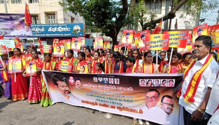 தமிழகத்தில் பெண்களுக்கு எதிரான தொடர் பாலியல் வன்கொடுமைகளை தடுக்கவும், பெண்களுக்கு எதிராக நடக்கும் அநீதியை தடுக்க தவறிய தமிழக அரசை கண்டித்து கண்டன ஆர்ப்பாட்டம் நடைபெற்றது.