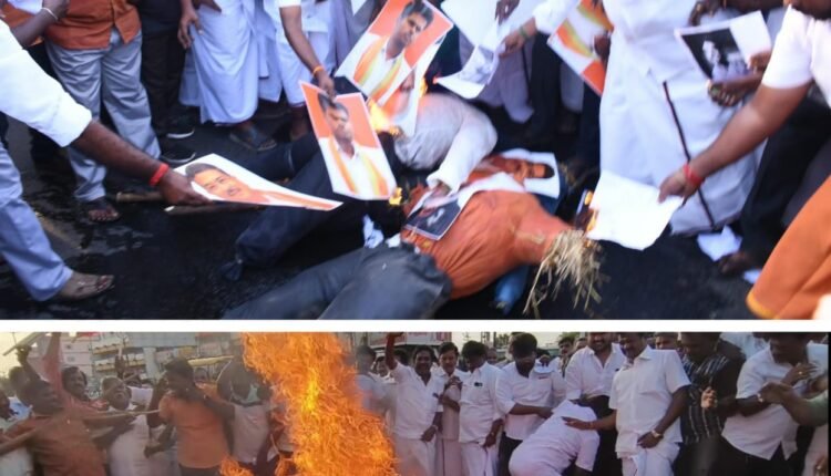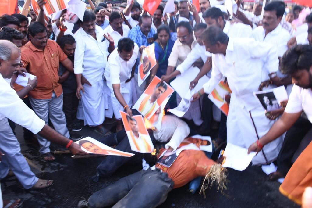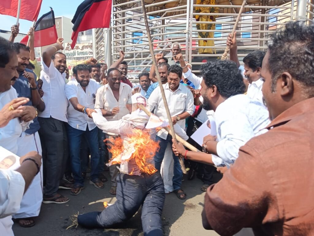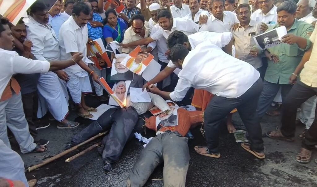 இந்தியாவின் பிரதமர் நரேந்திர மோடி மற்றும் தமிழக பாரதிய ஜனதா கட்சி தலைவர் அண்ணாமலை ஆகியோரின் உருவ படங்களையும் மத்திய அமைச்சர் தர்மேந்திர பிரதானின் உருவ பொம்மையையும் எரித்து அவர்கள் தங்களுடைய எதிர்ப்பை பதிவு செய்தனர். தர்மேந்திர பிரதானி புகைப்படத்தையும் கிழித்து எரிந்தனர்.
