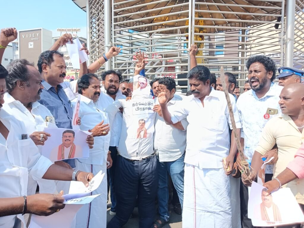தமிழ்நாடு மக்கள் குறித்து இழிவாக பேசிய ஒன்றிய அமைச்சர் தர்மேந்திர பிரதானை கண்டித்து ஆர்ப்பாட்டம் நடைபெற்றது.
