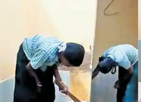 சமூக வலைதளங்களில் வெளியான வீடியோவில், இரண்டு சிறுமிகள் பள்ளி கழிப்பறையை சுத்தம் செய்வது பதிவாகி இருந்தது. இந்த வீடியோ வைரலானதால், மாவட்ட கல்வி அதிகாரிகள் உடனடியாக விசாரணை மேற்கொண்டனர். பெற்றோர்கள் மற்றும் உள்ளூர் மக்கள், பள்ளி அதிகாரிகள் மாணவர்களை கழிப்பறையை சுத்தம் செய்ய கட்டாயப்படுத்தியதாக குற்றம் சாட்டினர். ஆனால், மாணவர்கள் தாங்களாகவே முன்வந்து சுத்தம் செய்ததாக பள்ளி தரப்பில் ஆசிரியர்கள் தெரிவித்தனர். இருப்பினும், மாணவர்கள் படிப்பில் கவனம் செலுத்த வேண்டிய நேரத்தில், சுத்தம் செய்யும் பணிகளில் ஈடுபடுவது ஏற்றுக்கொள்ள முடியாதது என்று கல்வி அதிகாரிகள் தெரிவித்தனர். இந்த சம்பவம் குறித்து வட்டார கல்வி அலுவலர் பி.கௌரி விசாரணை மேற்கொண்டார்.