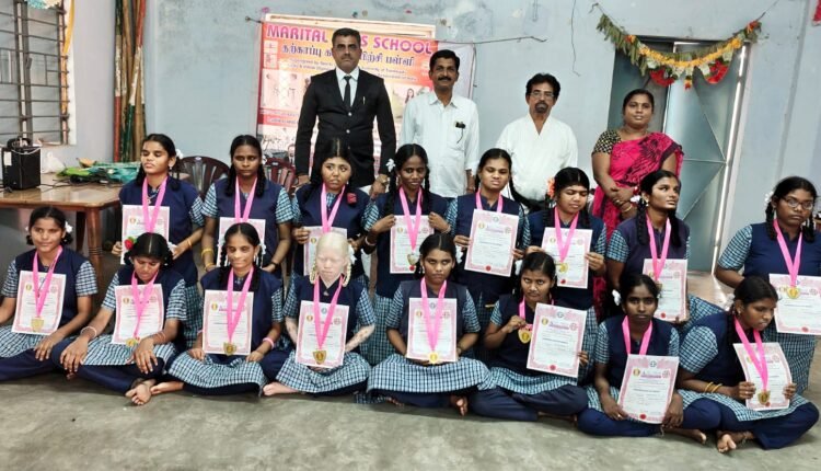 கராத்தே கற்ற திருச்சி புத்தூர் விழி இழந்தோர் பள்ளி மாணவிகளுக்கு பதக்கம் மற்றும் சான்றிதழ்களை குற்றவியல் வழக்கறிஞர் சங்க செயலாளர் வழங்கினார்.
