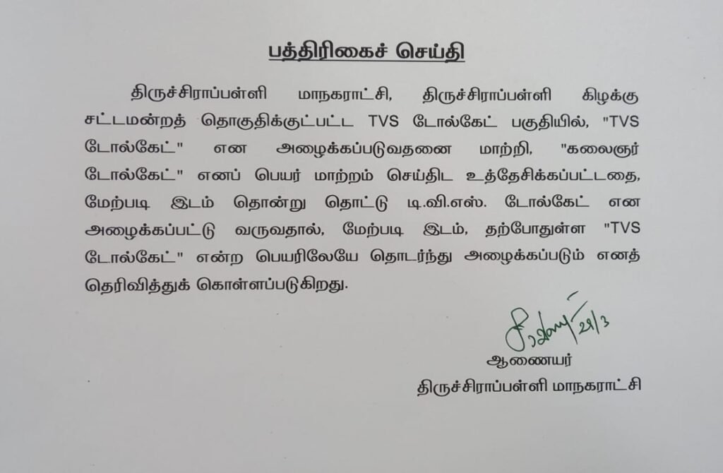 இதன் எதிரொலியாக இன்று மாலை திருச்சி மாநகராட்சி ஆணையர் தெரிவித்துள்ள செய்தி குறிப்பில் கலைஞர் டோல்கேட் டோல்கேட் என அழைக்கப்படாது , டிவிஎஸ் டோல்கேட் என்று அழைக்கப்படும் என அறிவித்துள்ளார்.