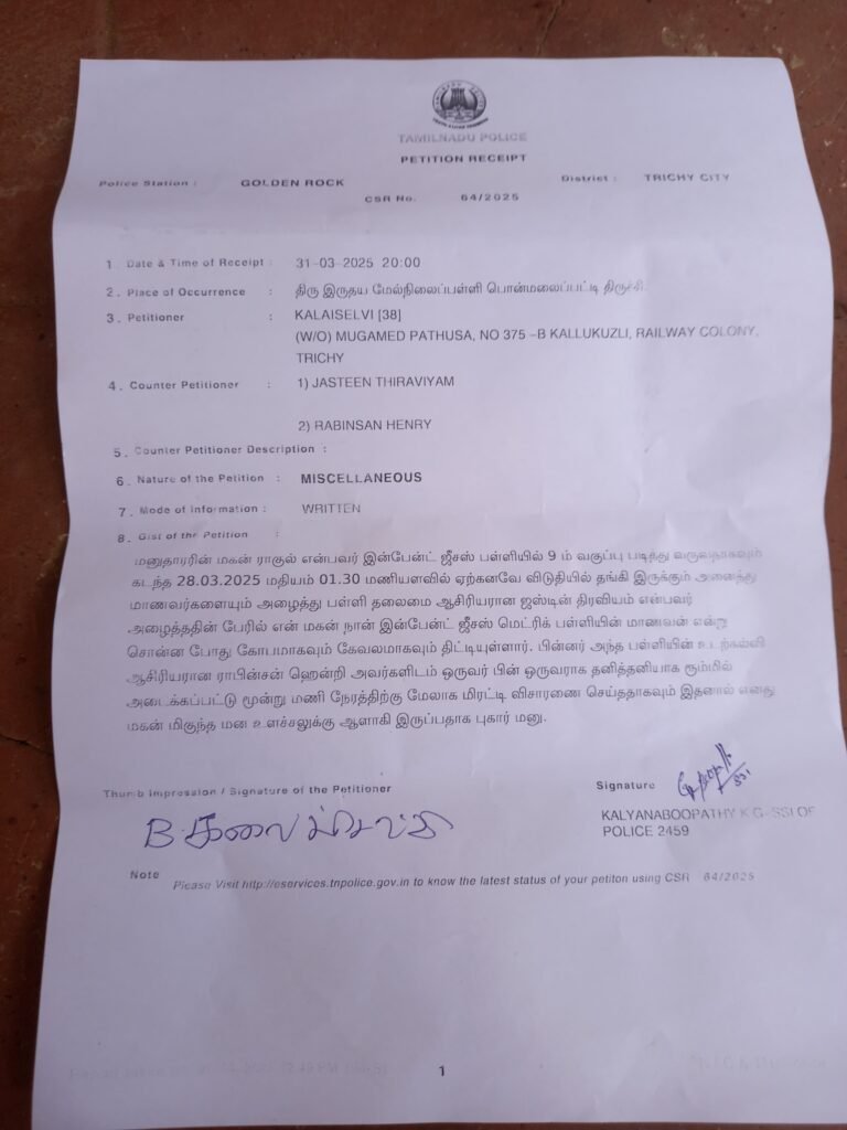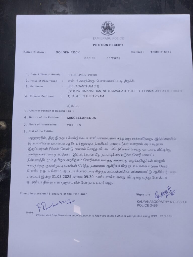 நேற்று பொன்மலை குற்றப்பிரிவு காவல் நிலையத்தில் தலைமை ஆசிரியர் ஜஸ்டின் திரவியத்தின் மீது பொன்மலை கவுரவ தெரு பகுதியில் வசிக்கும் பத்மநாபனின் மகன் ஜீவானந்தம் (வயது 40) என்பவர் இது குறித்து தகுந்த நடவடிக்கை எடுக்கப்பட வேண்டும் என புகார் மனு அளித்தார்.