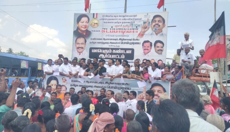 பெண்களைப் பற்றி தவறாக பேசிய வனத்துறை அமைச்சர் பொன்முடியை கண்டித்து திருச்சி அதிமுக புறநகர் வடக்கு மாவட்ட செயலாளர் பரஞ்ஜோதி தலைமையில் ஆர்ப்பாட்டம்.