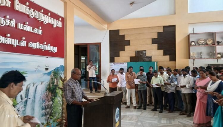 தமிழ்நாடு அரசு போக்குவரத்துக் கழகம் கும்பகோணம் கோட்டம் திருச்சி மண்டல அலுவலகத்தில் ஒவ்வொரு ஆண்டும் ஜூன் மாதம் 12-ந் தேதி குழந்தை தொழிலாளர் முறை எதிர்ப்பு தினம் அனுசரிக்கப்பட்டு வருகிறது .அந்த வகையில் இன்று குழந்தை தொழிலாளர் முறையினை அகற்றுவதற்கான உறுதிமொழியினை துணை மேலாளர் (பணியாளர் மற்றும் சட்டம்) ராமநாதன் முன்னிலையில் அனைத்து போக்குவரத்து கழக பணியாளர்கள் உறுதிமொழி எடுத்துக் கொண்டனர். உறுதிமொழி ஏற்கும் நிகழ்ச்சியில் துணை மேலாளர் ஜூலியஸ் அற்புத ராயன் (வழி தாள் வசூல் )மற்றும் அனைத்து போக்குவரத்துக் கழகம் பணியாளர்கள் உறுதிமொழி எடுத்துக்கொண்டனர்.