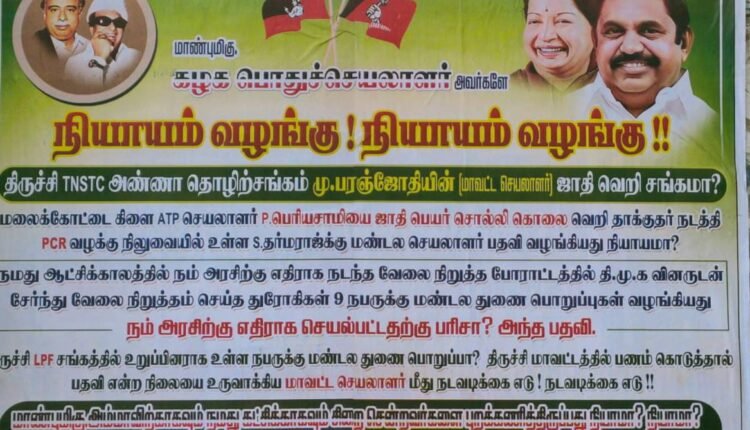திருச்சி அதிமுக வடக்கு மாவட்டம் மற்றும் மாநகர் மாவட்டம் முழுவதும் பி சி ஆர் வழக்கு உள்ளவரிடம் பணம் பெற்றுக் கொண்டு அதிமுக வடக்கு மாவட்ட செயலாளர் பதவி அளித்ததாக கூறி ஓட்டப்பட்டுள்ள போஸ்டரால் பரபரப்பு ஏற்பட்டுள்ளது .