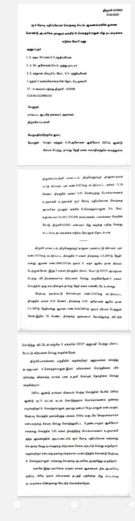 நாங்கள் 2007 ம் ஆண்டு கிரயம் பெற்று எங்கள் சுவாதீனத்தில் உள்ள திருவெறும்பூர் நவல்பட்டு கிராமத்தில் உள்ள 5. 83 ஏக்கர் நிலத்தை போலி ஆவணம் தயாரித்து ரூ. 6 கோடி மதிப்பிலான அந்த சொத்தை அபகரிக்க திருச்சியைச் சேர்ந்த வக்கீல் ஒருவர் முயன்று வருகிறார்.