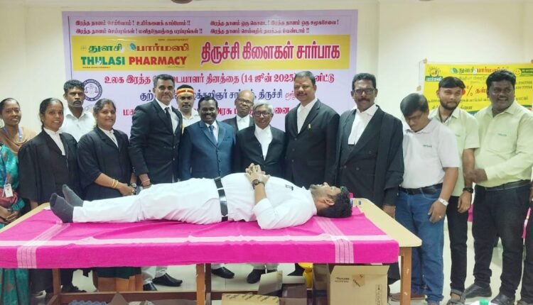 உலக ரத்த கொடையாளர் தினத்தை முன்னிட்டு திருச்சிராப்பள்ளி குற்றவியல் வழக்கறிஞர்கள் சங்கம் மற்றும் தனியார் பார்மசி, அரசு மருத்துவமனையுடன் இணைந்து ரத்ததான முகாம் நீதிமன்ற வளாகத்தில் நடைபெற்றது.