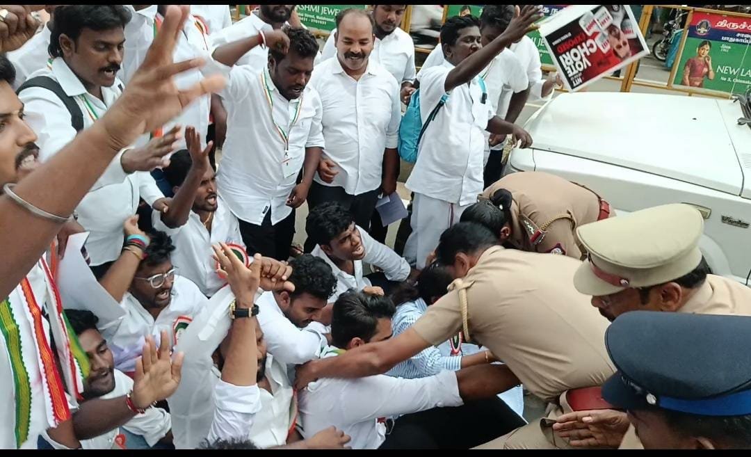 பாசிச பாஜக அரசின் தேர்தல் ஆணைய முறைகேட்டை கண்டித்து தமிழ்நாடு இளைஞர் காங்கிரஸ் மாநிலத் தலைவர் கே.பி.சூர்யா பிரகாஷ் தலைமையில் அகில இந்திய இளைஞர் காங்கிரஸ் செயலாளர் சஹரிக்க ராவ் முன்னிலையில் சத்திரம் பேருந்து நிலையம் அருகே மாபெரும் கண்டன ஆர்ப்பாட்டமும் சாலை மறியலும் நடைபெற்றது.