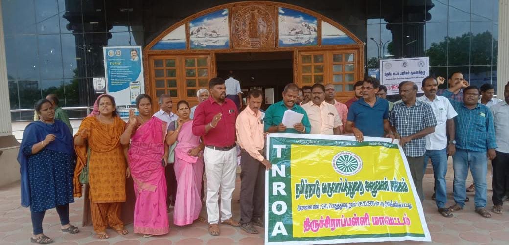தமிழ்நாடு வருவாய்த்துறை அலுவலர் சங்கம் சார்பில் 7 அம்ச கோரிக்கைகளை தமிழக அரசு உடனடியாக நிறைவேற்றிட வலியுறுத்தி 14 ஆயிரம் வருவாய் துறை அலுவலர்கள் பங்கேற்கும் 48 மணி நேரத்தில் தொடர் வேலை நிறுத்த போராட்டம் திருச்சியில் துவங்கியது