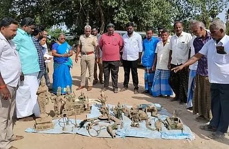 திருச்சி மாவட்டம், காட்டுப்புத்தூா் அருகே பள்ளம் தோண்டியபோது, 10 பழைமையான பஞ்சலோக சிலைகள் மற்றும் 22 சிலைகளின் உதிரிப் பாகங்கள் நேற்று ஞாயிற்றுக்கிழமை கண்டெடுக்கப்பட்டது.