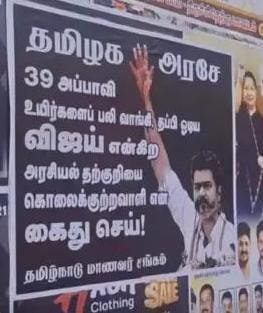 அந்த போஸ்டரில், ’39 அப்பாவி உயிர்களை பலி வாங்கி, தப்பி ஓடிய விஜய் என்ற அரசியல் தற்குறியை கொலைக் குற்றவாளி என கைது செய்’ என குறிப்பிடப்பட்டுள்ளது.