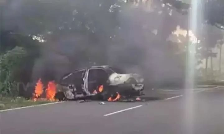 சரியான நேரத்தில் காரை விட்டு வெளியேறியதால், கணவன், மனைவி இருவரும் லேசான காயங்களுடன் அதிர்ஷ்டவசமாக உயிர் தப்பினர். சாலையின் நடுவே கார் தீ பற்றி எரிந்த சம்பவத்தால் அப்பகுதியில் சிறிது நேரம் போக்குவரத்து பாதிக்கப்பட்டது.