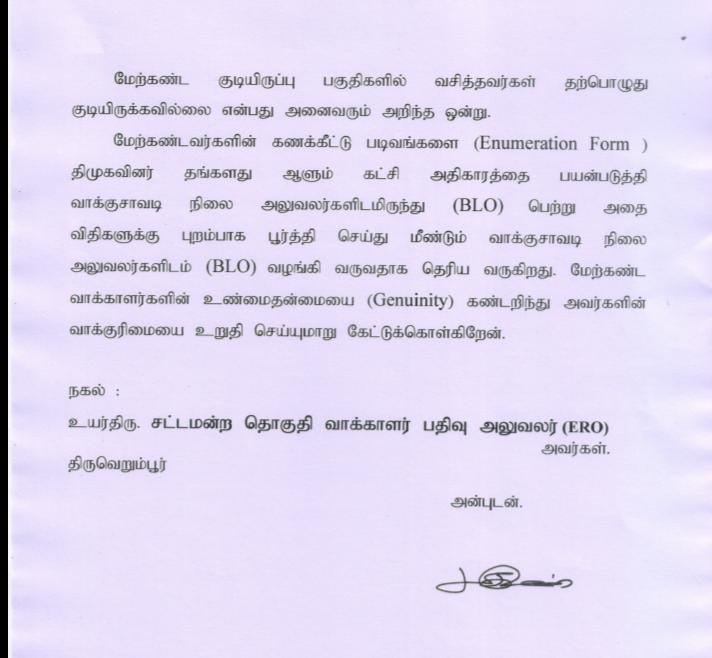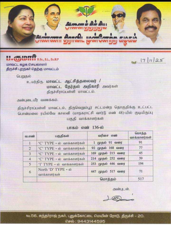 மேற்கண்டவர்களின் கணக்கீட்டு படிவங்களை (Enumeration Form) திமுகவினர் தங்களது ஆளும் கட்சி அதிகாரத்தை பயன்படுத்தி வாக்குசாவடி நிலை அலுவலர்களிடமிருந்து (BLO) பெற்று அதை விதிகளுக்கு புறம்பாக பூர்த்தி செய்து மீண்டும் வாக்குசாவடி நிலை அலுவலர்களிடம் (BLO) வழங்கி வருவதாக தெரிய வருகிறது. மேற்கண்ட வாக்காளர்களின் உண்மைதன்மையை (Genuinity) கண்டறிந்து அவர்களின் வாக்குரிமையை உறுதி செய்யுமாறு கேட்டுக்கொள்கிறேன் என திருச்சி அதிமுக தெற்கு மாவட்ட செயலாளர் குமார் வெளியிட்டுள்ள புகார் மனுவில் தெரிவித்துள்ளார் .