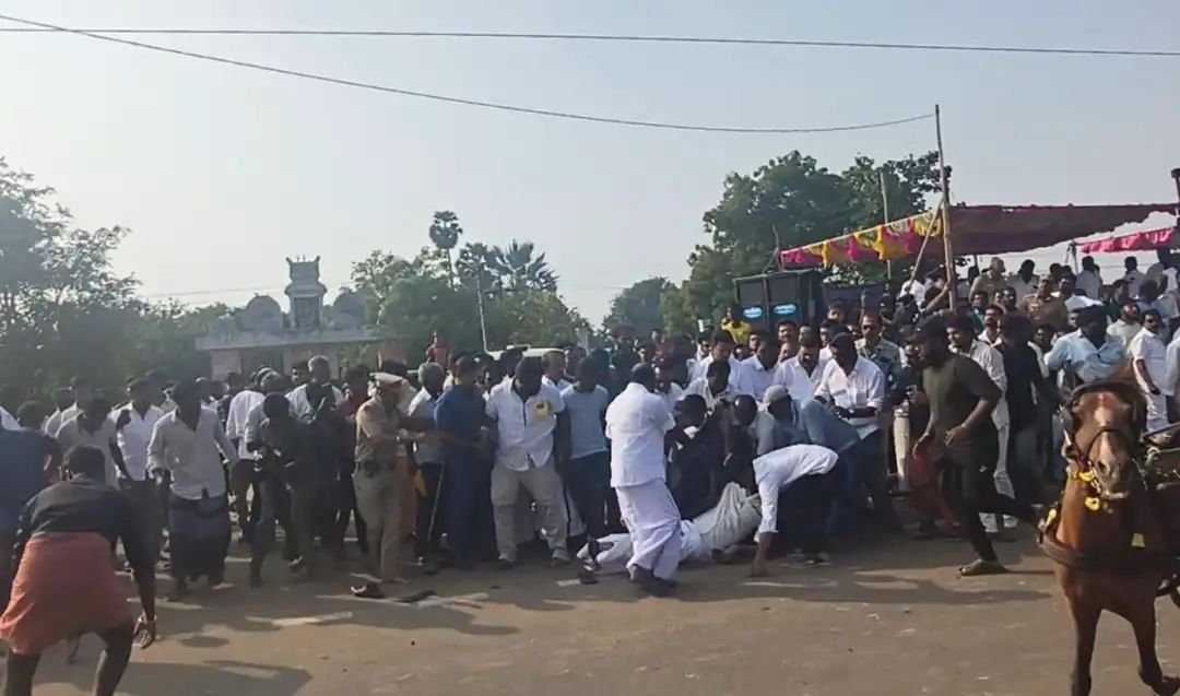 அப்போது, திருவெறும்பூர் ஒன்றிய முன்னாள் துணை தலைவரும், திமுக பொதுக்குழு உறுப்பினருமான நவல்பட்டு சண்முகம், குதிரை வண்டி மோதியதில் கீழே விழுந்து தலையில் பலத்த அடிபட்டது.