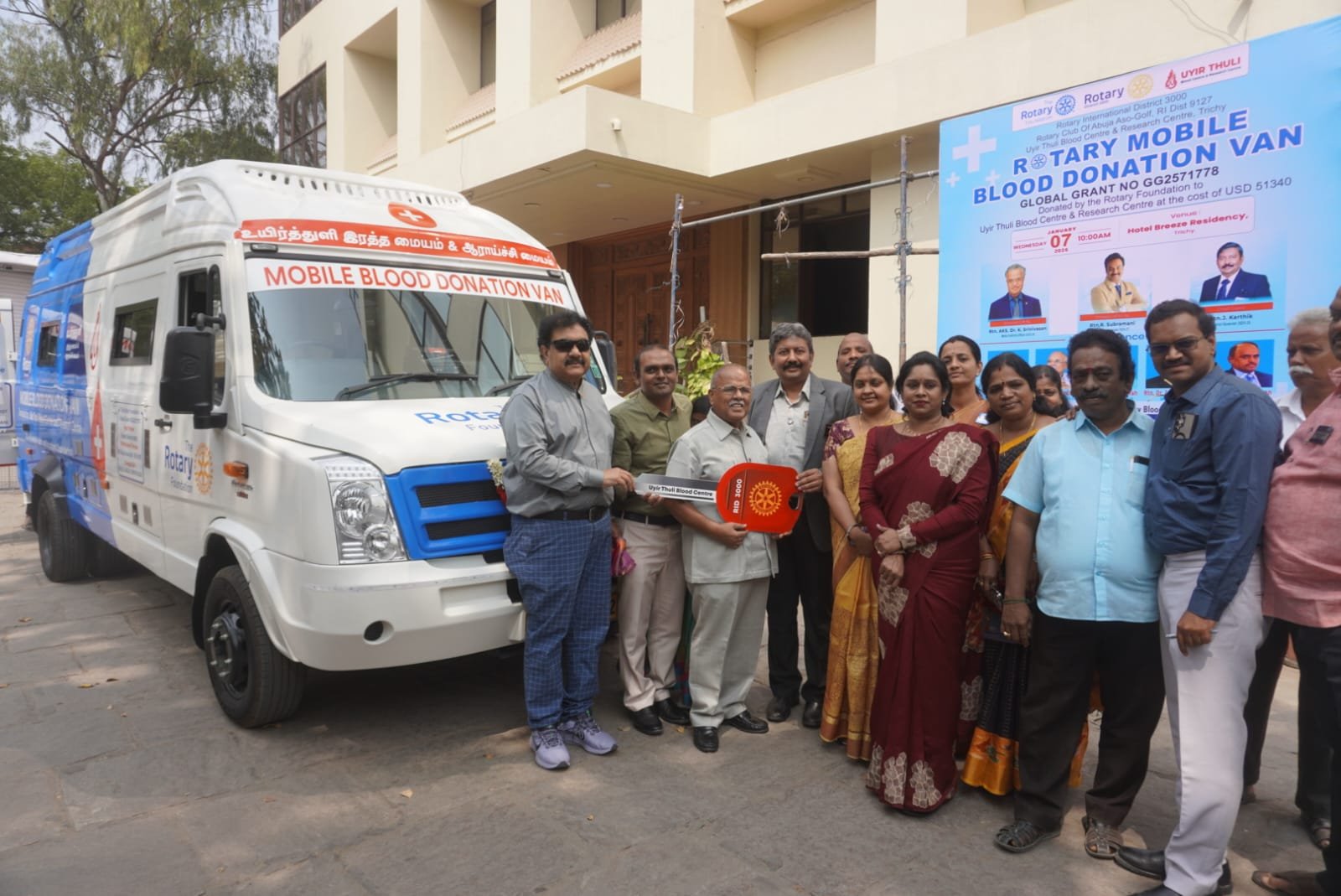 ரோட்டரி மாவட்டம் 3000 சார்பில் நடமாடும் ரத்ததான வாகனம் உயிர்த்துளி ரத்த மையம் மற்றும் ஆராய்ச்சி மையத்திற்கு வழங்கும் நிகழ்ச்சி திருச்சியில் நேற்று புதன்கிழமை நடைபெற்றது .
