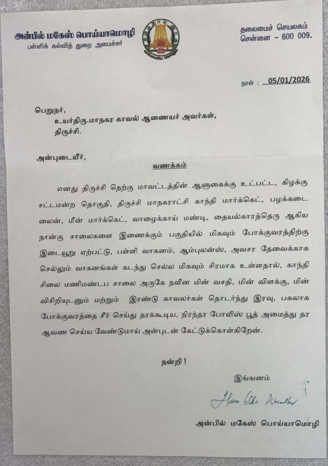 கடந்த செவ்வாய்க்கிழமை (5.1.2026) அன்று தங்களை நேரில் சந்தித்து பள்ளிக்கல்வித்துறை அமைச்சர் முனைவர் மகேஷ் மகேஷ் பொய்யா மொழி எழுதி கையெழுத்திட்ட கடிதத்தை தங்களிடம் வழங்கினோம்.அதில் திருச்சி காந்தி மார்க்கெட் சுற்றியுள்ள பகுதிகளில் போக்குவரத்து நெரிசல் ஏற்படும் நிலையை சரி செய்யும் வகையில் காந்தி சிலை மணிமண்டபம் சாலை,பழக்கடை லைன், மீன் மார்க்கெட், வாழைக்காய் மண்டி,தையல்காரர் தெரு ஆகிய பகுதிகளை இணைக்கும் நான்கு ரோடு சந்திப்பில் இரவு பகல் நேரத்திலும் போக்குவரத்து காவல் பூத் அமைத்து ஆம்புலன்ஸ்,பள்ளி வாகனங்கள்,பொதுமக்கள் வாகனங்கள் ஆகியவற்றுக்கு சிரமம் ஏற்படாமல் செல்ல நடவடிக்கை எடுக்கக்கோரி அமைச்சர் மகேஷ் பொய்யாமொழி கையெழுத்திட்ட கடிதத்தை வழங்கி இருந்தார்கள்.அதை நாங்கள் தங்களிடம் வழங்கி கோரிக்கை வைத்தபோது ரெடிமேட் பூத் எங்களிடம் உள்ளது அதனை வைத்து உடனடியாக ஏற்பாடு செய்வதாக வாக்குறுதி அளித்தீர்கள்.