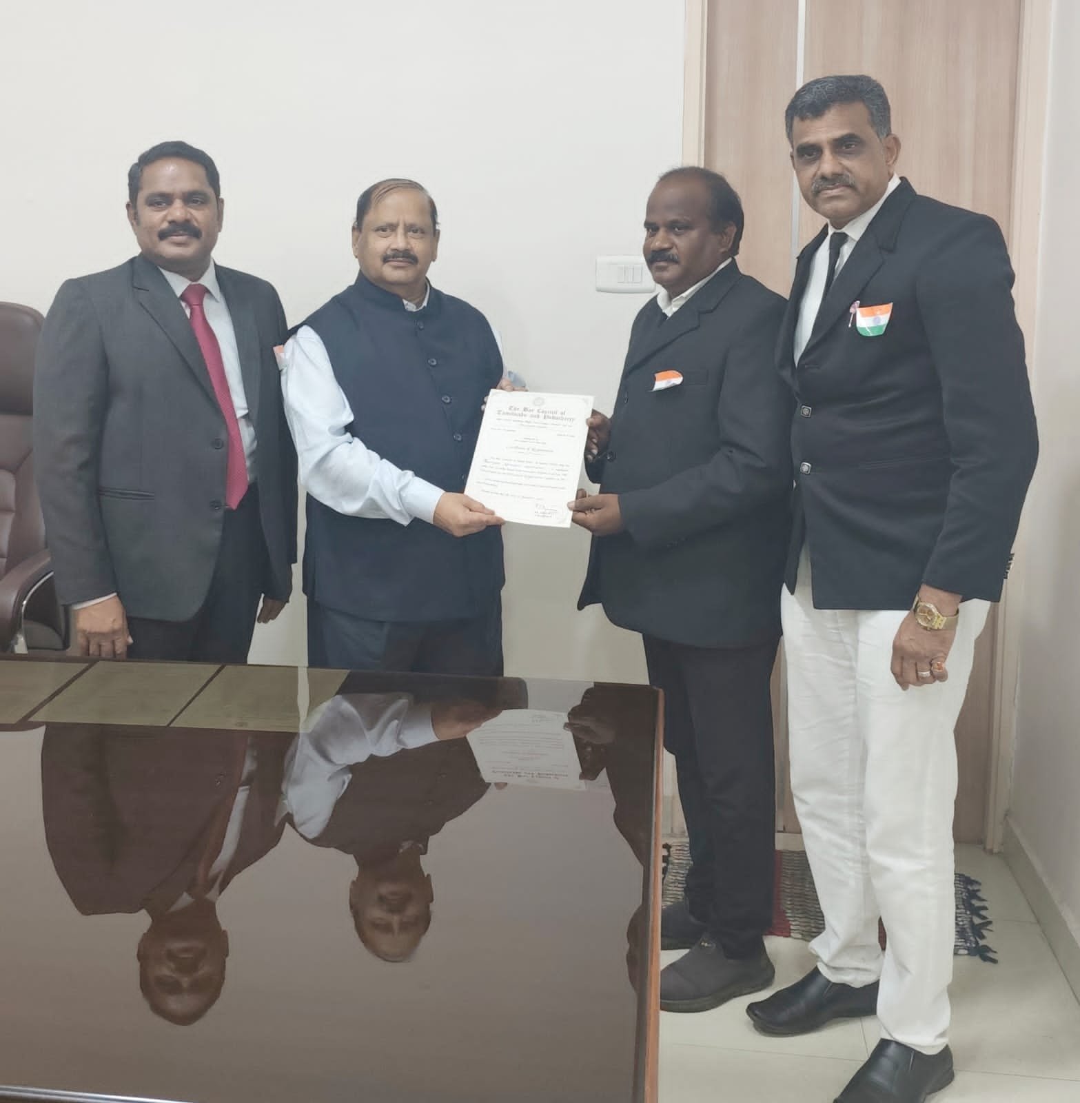 திருச்சி குற்றவியல் வழக்கறிஞர் சங்க செயலாளர் வெங்கட் உடன் இருந்தார். மேலும் தமிழ்நாடு பார் கவுன்சில் சேமநல முத்திரை யை பார் கவுன்சில் தலைவர் P. S. அமல்ராஜ் அவர்கள் வழங்கினார்.