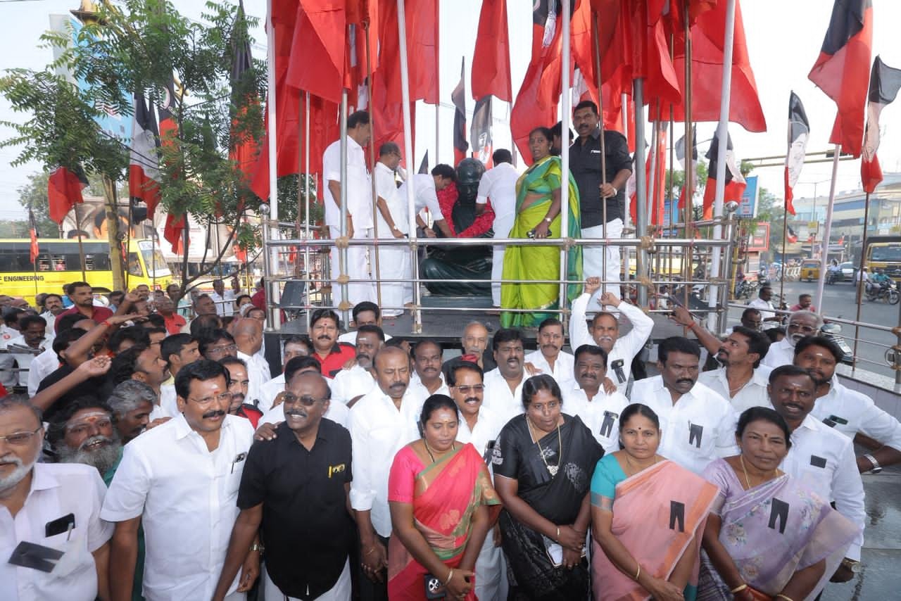 பின்னர் செய்தியாளர்களை சந்தித்து பேசிய அமைச்சர் அன்பில் மகேஸ் பொய்யாமொழி…. இன்று மௌன ஊர்வலமாக வந்து அண்ணா சிலைக்கு அஞ்சலி செலுத்தி உள்ளோம். எங்களது உறுதிமொழியாக 2026 ல் ஸ்டாலின் தொடரட்டும் தமிழ்நாடு வெல்லட்டும் என்ற கோரிக்கையுடனும், கலைஞரின் ஐம்பெரும் முழக்கங்களையும் இங்கே எழுப்பியிருக்கிறோம்.
