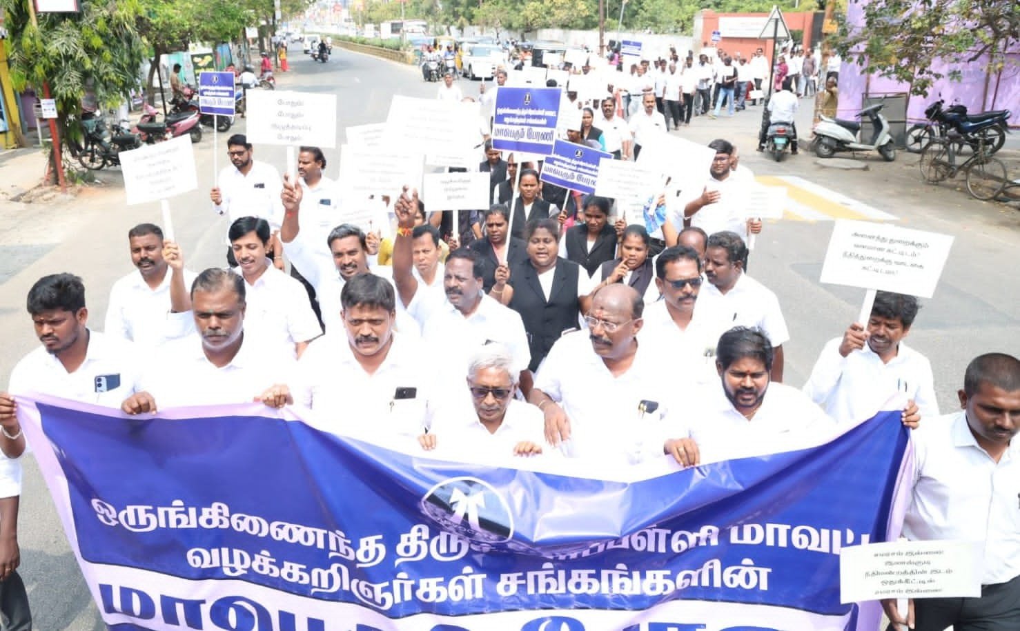 இன்று இரண்டாவது நாளாக ஒருங்கிணைந்த திருச்சி மாவட்ட வழக்கறிஞர் சங்கங்கள் சார்பில்நீதிமன்றம் முன்பிருந்து, மேஜர் சரவணன் ஸ்தூபி வழியாக திருச்சி மாவட்ட ஆட்சித்தலைவர் அலுவலகத்திற்கு பேரணியாக அனைவரும் நடந்து சென்றனர்.