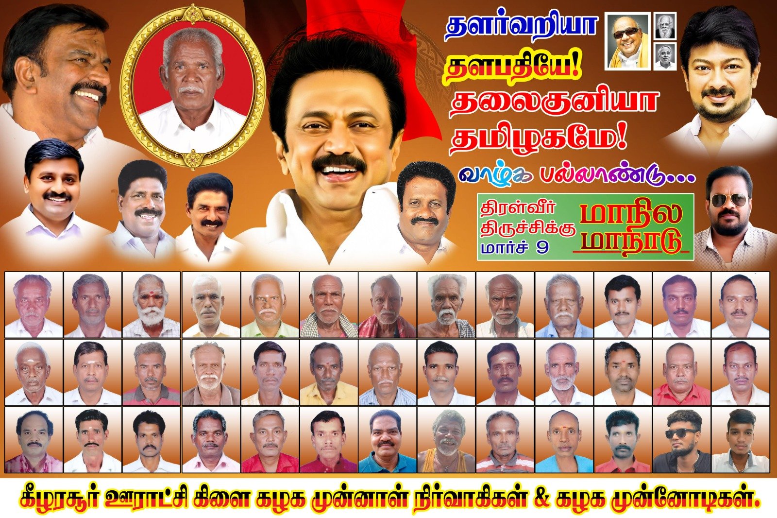 திருச்சி மாவட்டம், லால்குடி சட்டமன்ற தொகுதி, புள்ளம்பாடி ஒன்றியத்திற்கு உட்பட்ட கீழ அரசூர் கிராமத்தில் தமிழக முதல்வர் மு. க. ஸ்டாலின் பிறந்த நாளை (மார்ச் 1) முன்னிட்டும் திருச்சியில் மார்ச் 9 ம் தேதி நடைபெற உள்ள திமுக மாநில மாநாட்டிற்கு அழைக்கும் வகையிலும் புள்ளம்பாடி ஒன்றிய முன்னாள் திமுக இளைஞரணி செயலாளரும், முன்னாள் ஒன்றிய கவுன்சிலர் பார்த்திபன் ராமசாமி தலைமையில் கீழரசூர் ஊராட்சி திமுக கிளை கழக முன்னாள் நிர்வாகிகள் மற்றும் கழக முன்னோடிகள் சார்பில் வாழ்த்து விளம்பரம் வைக்கப்பட்டது.