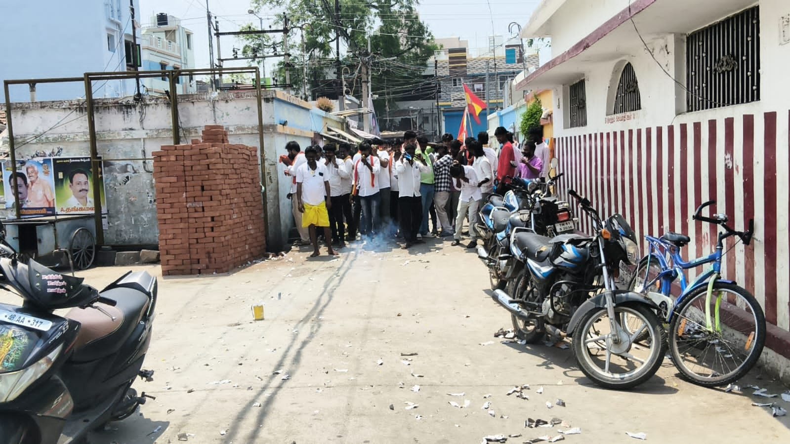 திருச்சியில் பட்டாசு வெடித்து, இனிப்புகள் வழங்கி கொண்டாடிய தமிழக வெற்றிக் கழகத்தினர்.