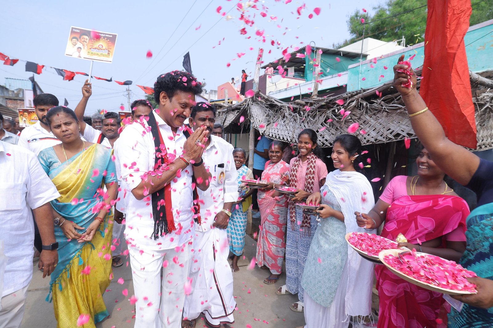 திருவெறும்பூர் சட்டமன்றத் தொகுதி திமுக வேட்பாளர் மகேஷ் பொய்யாமொழிக்கு மலர் தூவி உற்சாக வரவேற்பு அளித்த பொதுமக்கள்