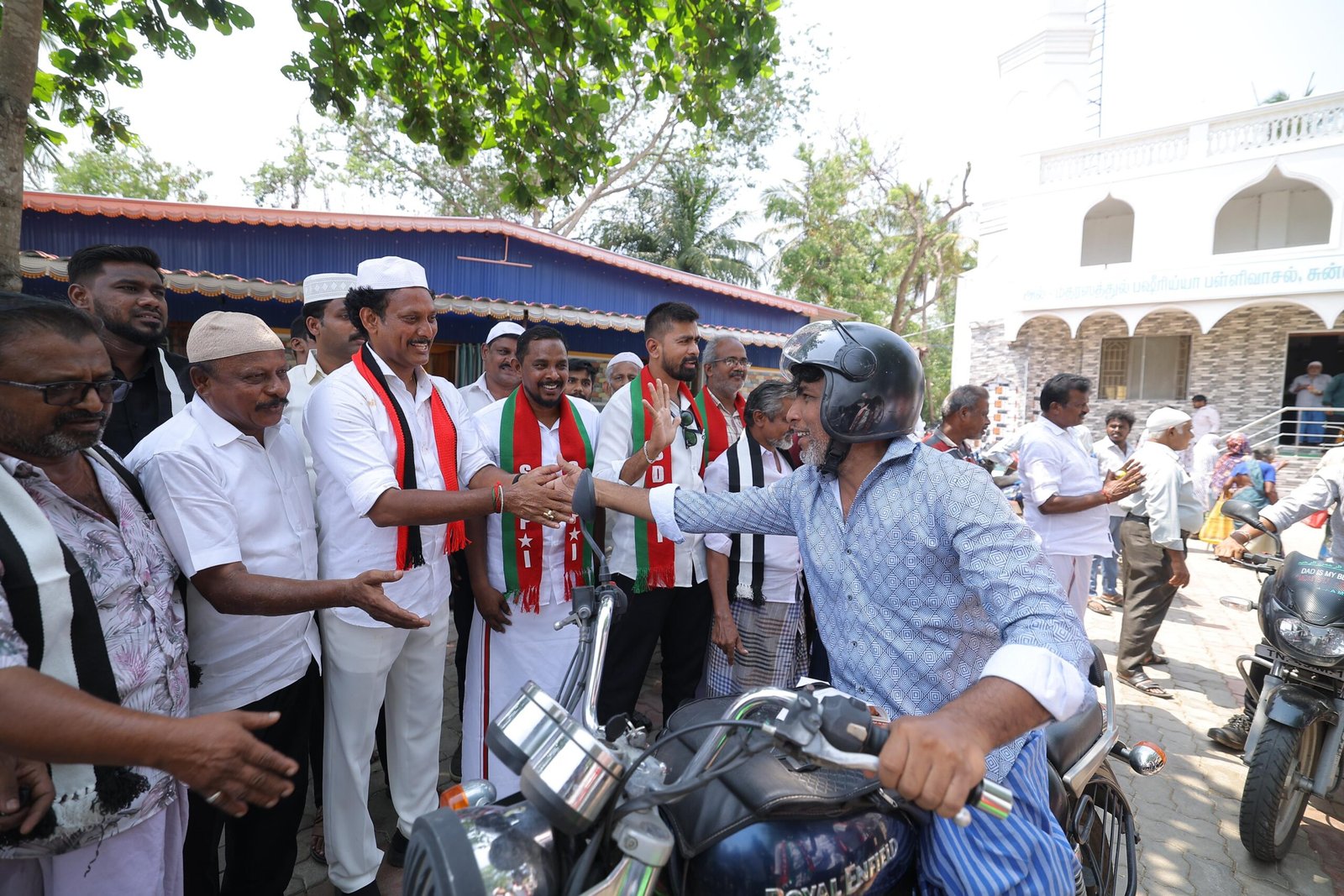 திருச்சி திருவெறும்பூர் தொகுதியில் தொழுகை முடிந்து வந்த இஸ்லாமியப் பெருமக்களிடம் வாக்குகள் சேகரித்த அமைச்சர் மகேஷ் பொய்யாமொழி