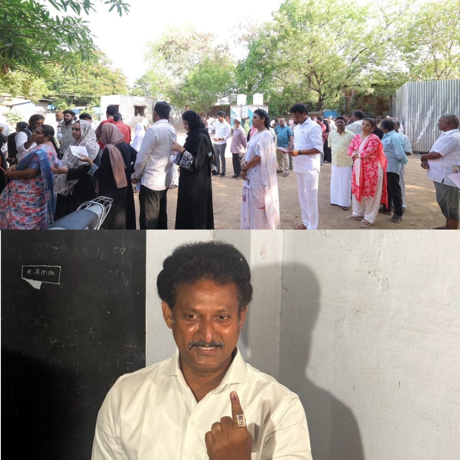 ஒரு மணி நேரத்துக்கு மேலாக மக்களோடு மக்களாக நீண்ட வரிசையில் காத்து நின்று வாக்களித்த திருவெறும்பு சட்டமன்ற தொகுதி உறுப்பினர் முனைவர் மகேஷ் பொய்யாமொழி .